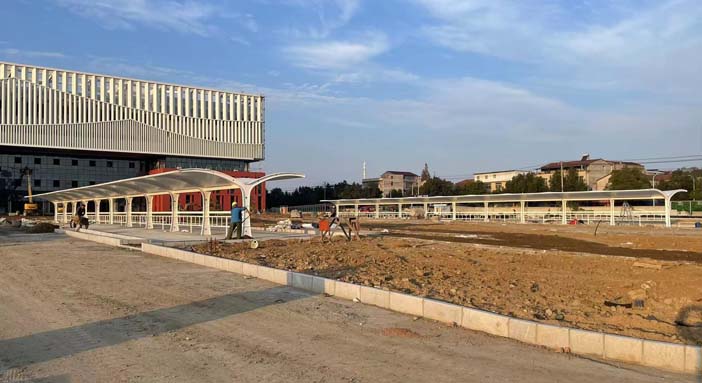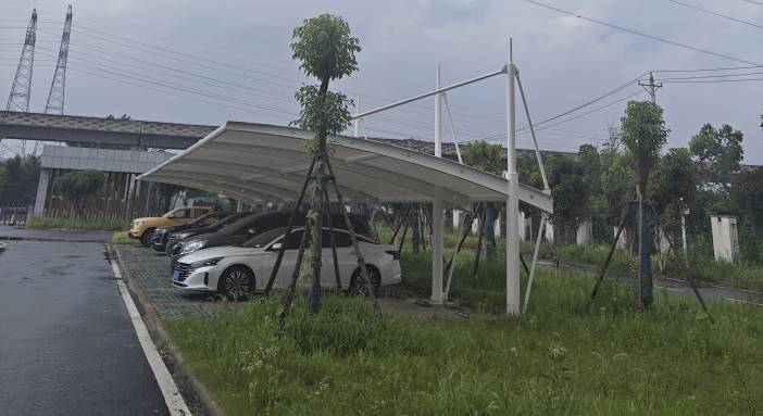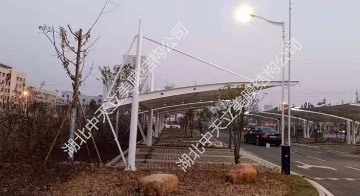 鄂州二中膜结构车棚项目已完工,该项目分6处地方,有汽车停车棚,电动车停车棚,总面积2906m²。