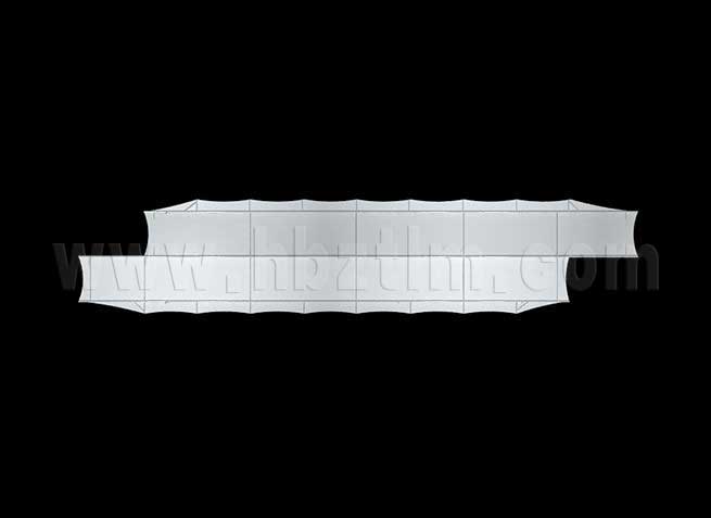 膜材采用PVDF国产或者进口建筑膜材、PTFE玻璃纤维建筑膜材、ETFE透明的永久性建筑膜材;自动放样裁剪,高频焊接,拉伸效果超强,曲线成型可千变万化;膜材质保一般可达15-20年。