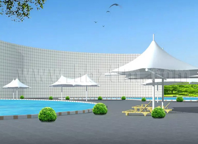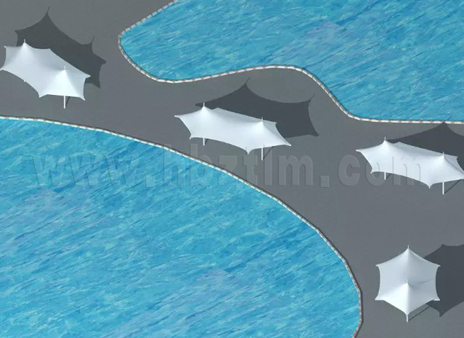 膜材采用PVDF国产或者进口建筑膜材、PTFE玻璃纤维建筑膜材、ETFE透明的永久性建筑膜材;自动放样裁剪,高频焊接,拉伸效果超强,曲线成型可千变万化;膜材质保一般可达15-20年。