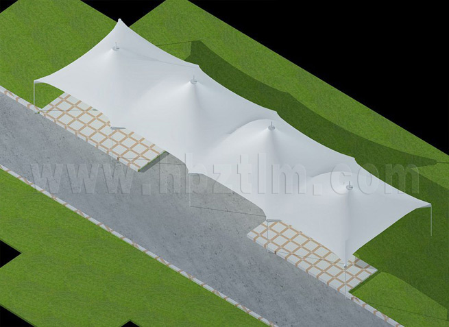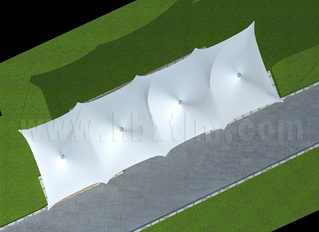 膜材采用PVDF国产或者进口建筑膜材、PTFE玻璃纤维建筑膜材、ETFE透明的永久性建筑膜材;自动放样裁剪,高频焊接,拉伸效果超强,曲线成型可千变万化;膜材质保一般可达15-20年。