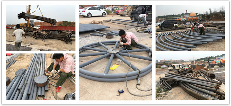 钢材选用Q235/Q345碳素钢、热镀锌或螺旋及无缝高强度优质钢材;抛丸防锈处理、喷漆,数控线切割、机拉/滚弯,钢构拼接造型及安装工艺等。
