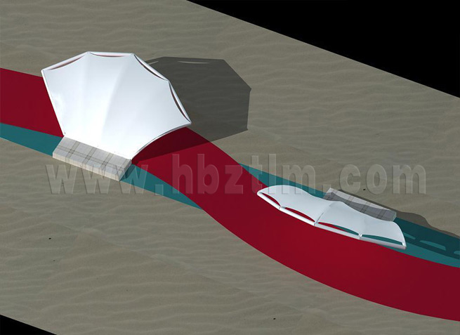 膜材采用PVDF国产或者进口建筑膜材、PTFE玻璃纤维建筑膜材、ETFE透明的永久性建筑膜材;自动放样裁剪,高频焊接,拉伸效果超强,曲线成型可千变万化;膜材质保一般可达15-20年。