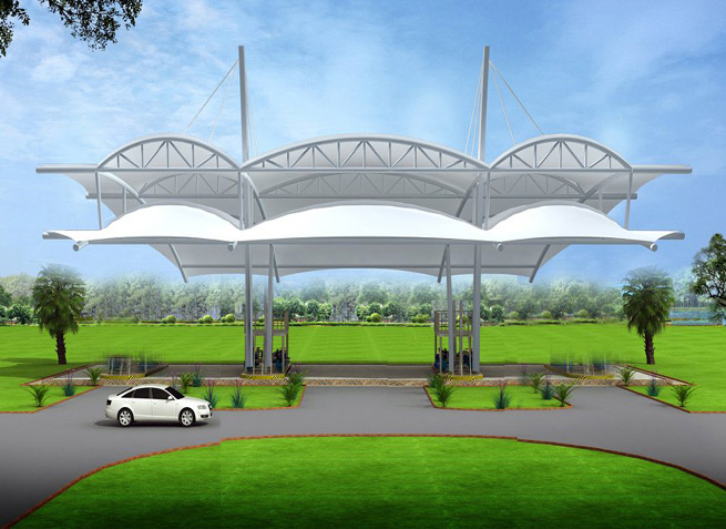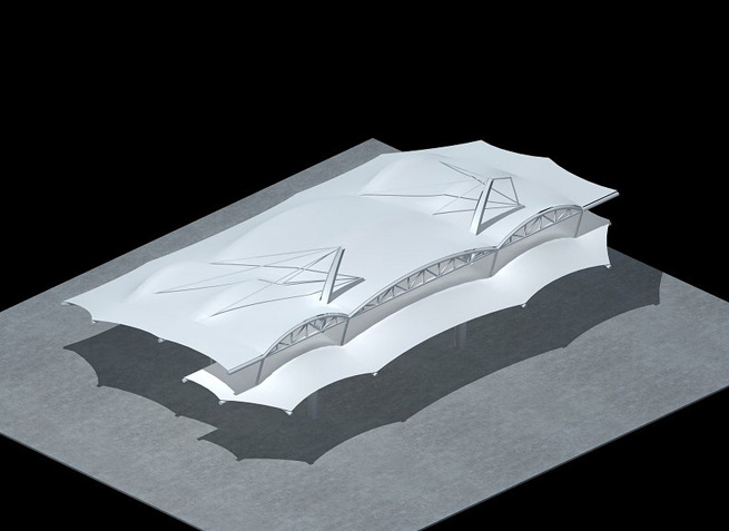 膜材采用PVDF国产或者进口建筑膜材、PTFE玻璃纤维建筑膜材、ETFE透明的永久性建筑膜材;自动放样裁剪,高频焊接,拉伸效果超强,曲线成型可千变万化;膜材质保一般可达15-20年。
