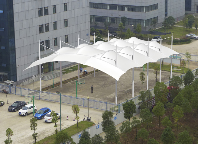 膜材采用PVDF国产或者进口建筑膜材、PTFE玻璃纤维建筑膜材、ETFE透明的永久性建筑膜材;自动放样裁剪,高频焊接,拉伸效果超强,曲线成型可千变万化;膜材质保一般可达15-20年。