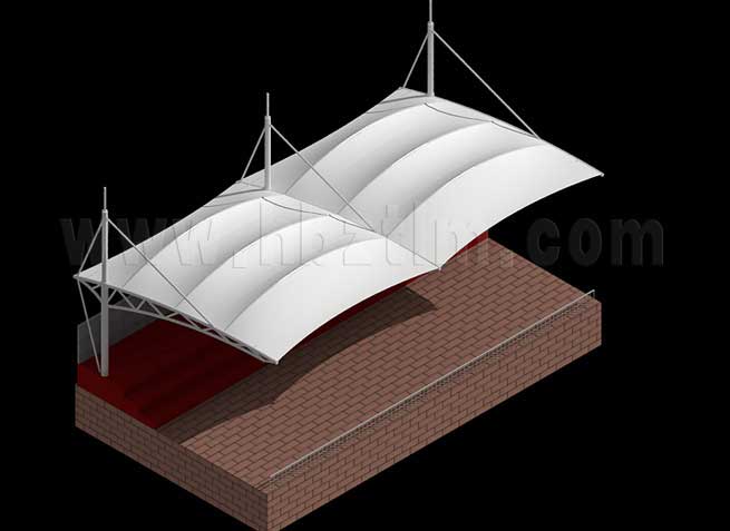 膜材采用PVDF国产或者进口建筑膜材、PTFE玻璃纤维建筑膜材、ETFE透明的永久性建筑膜材;自动放样裁剪,高频焊接,拉伸效果超强,曲线成型可千变万化;膜材质保一般可达15-20年。