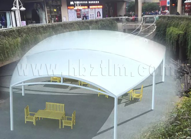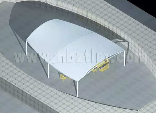 膜材采用PVDF国产或者进口建筑膜材、PTFE玻璃纤维建筑膜材、ETFE透明的永久性建筑膜材;自动放样裁剪,高频焊接,拉伸效果超强,曲线成型可千变万化;膜材质保一般可达15-20年。