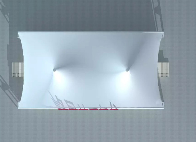 膜材采用PVDF国产或者进口建筑膜材、PTFE玻璃纤维建筑膜材、ETFE透明的永久性建筑膜材;自动放样裁剪,高频焊接,拉伸效果超强,曲线成型可千变万化;膜材质保一般可达15-20年。