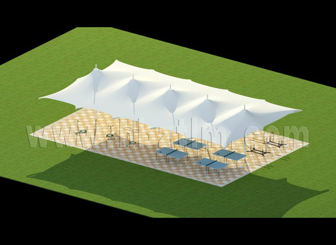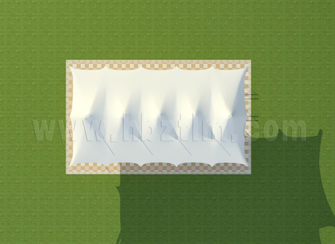 膜材采用PVDF国产或者进口建筑膜材、PTFE玻璃纤维建筑膜材、ETFE透明的永久性建筑膜材;自动放样裁剪,高频焊接,拉伸效果超强,曲线成型可千变万化;膜材质保一般可达15-20年。