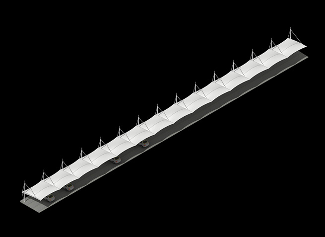 膜材采用PVDF国产或者进口建筑膜材、PTFE玻璃纤维建筑膜材、ETFE透明的永久性建筑膜材;自动放样裁剪,高频焊接,拉伸效果超强,曲线成型可千变万化;膜材质保一般可达15-20年。