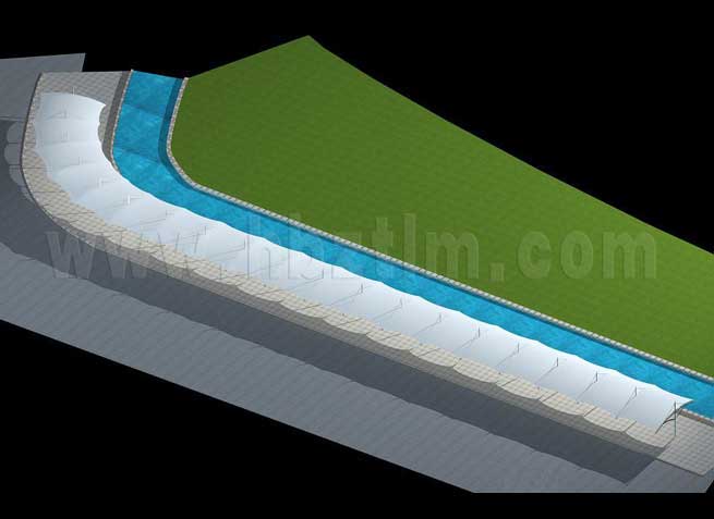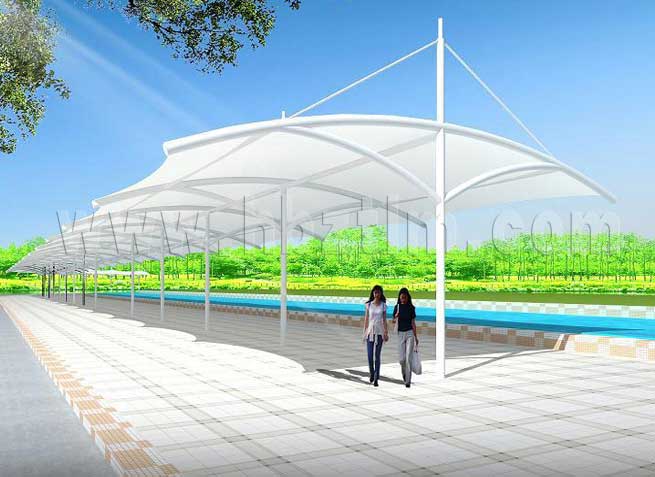 膜材采用PVDF国产或者进口建筑膜材、PTFE玻璃纤维建筑膜材、ETFE透明的永久性建筑膜材;自动放样裁剪,高频焊接,拉伸效果超强,曲线成型可千变万化;膜材质保一般可达15-20年。