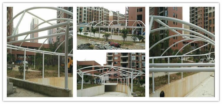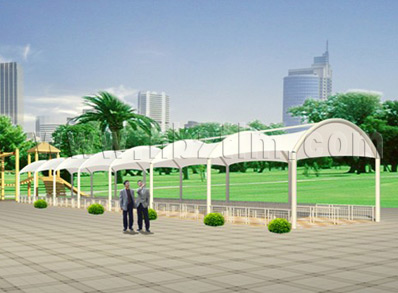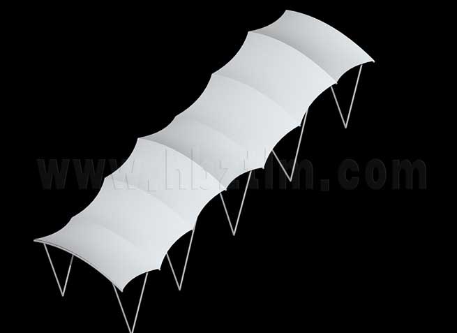 膜材采用PVDF国产或者进口建筑膜材、PTFE玻璃纤维建筑膜材、ETFE透明的永久性建筑膜材;自动放样裁剪,高频焊接,拉伸效果超强,曲线成型可千变万化;膜材质保一般可达15-20年。