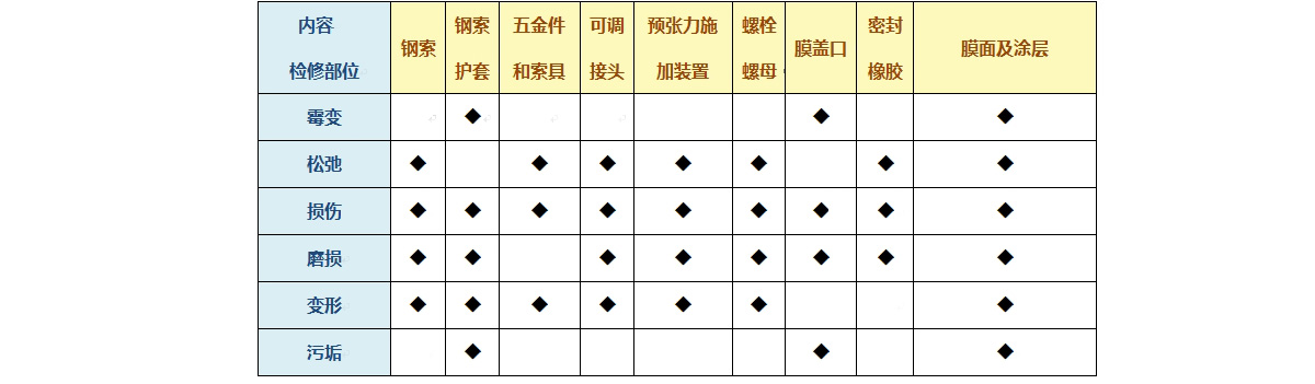 六 : 技术人员到现场维护或维修时应该检查膜结构是否处于正常工作状态。主要检查项目包括:膜面有无较大变形,膜面是否因预张力损失而松弛,膜面是否局部撕裂,膜材涂层是否剥离等。