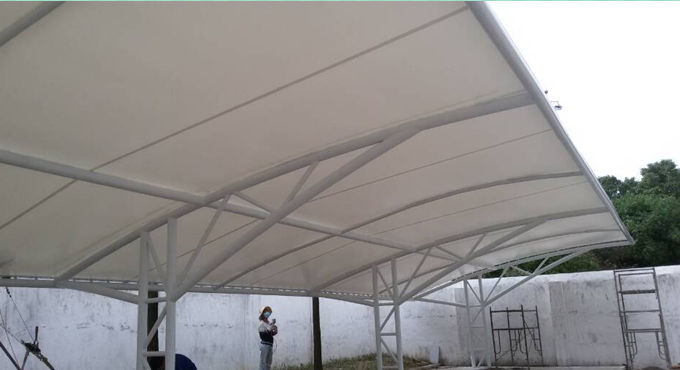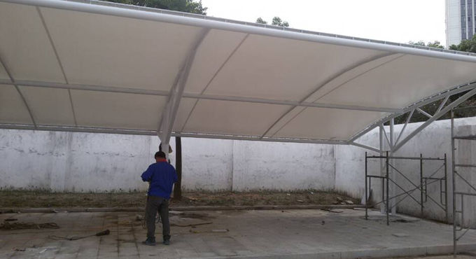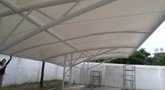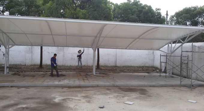 仙桃农商银行T型圆管膜结构自行车棚,本项目采用前软边后硬边张拉形式,结构由立柱、拉杆、挑梁、横杆构成,其挑梁和中间横杆一般采用弧型圆管挑梁形式,美观而不积水且抗负荷能力强;膜材采用PVDF白色车棚专用建筑膜材,15年质保,整体结构美观实用,经济牢固,臻至完美。