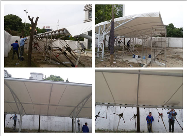 图2 仙桃农商行T型圆管膜结构自行车棚拉膜现场施工图