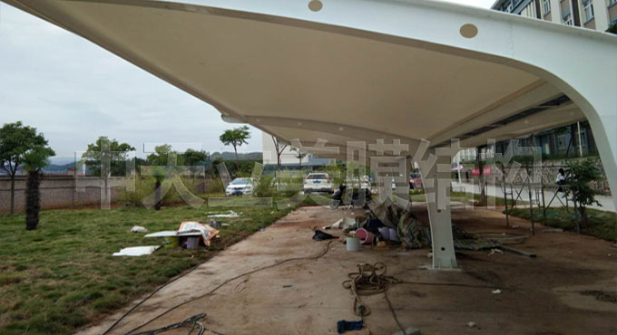 这次车棚项目选定是双挑L型膜结构自行车棚样式 ,共做两组膜结构自行车棚,以下照片为现场施工照片。