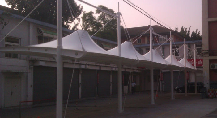 开工时间:2012年10月 查看详情北京冀北电网异形钢冒顶膜结构停车棚,本顶目为冒顶式膜结构车棚,采用连帽全软边张拉形式,美观而实用; 膜材采用PVDF白色车棚专用建筑膜材,整体结构从设计到施工,都精工细作,臻至完美。