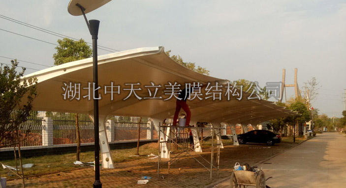 开工时间:2021.1.2 查看详情阳逻九宫山T型圆管膜结构车棚,本项目采用前软边后硬边张拉形式;结构由立柱、拉杆、挑梁、横杆构成,其挑梁和中间横杆采用弧型圆管挑梁形式,美观而不积水且抗负荷能力强;膜材采用PVDF白色车棚专用建筑膜材,15年质保,整体结构美观实用,经济牢固,臻至完美。