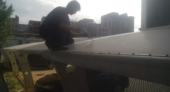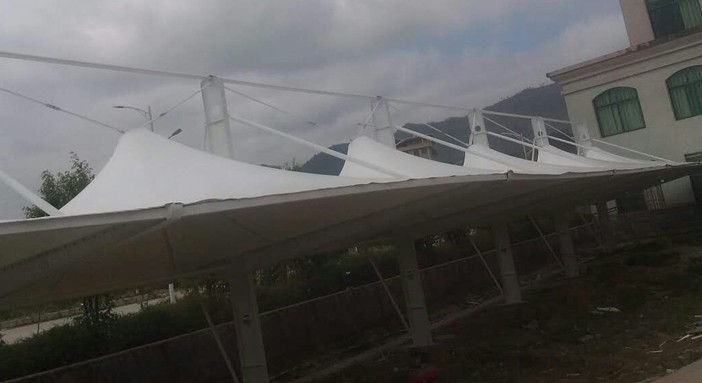 开工时间:2016年11月 查看详情新丰县环境保护局异型钢冒顶膜结构车棚,本顶目为冒顶式膜结构车棚,采用连帽全软边张拉形式,美观而实用; 膜材采用PVDF白色车棚专用建筑膜材,整体结构从设计到施工,都精工细作,臻至完美。
