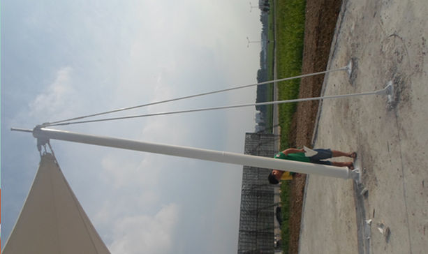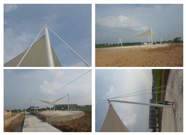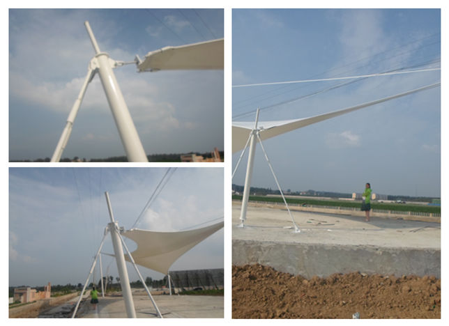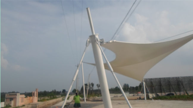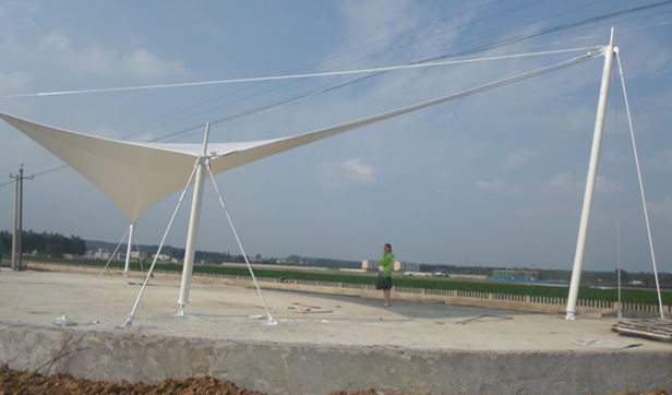 老河口市军用机场观景台张拉膜结构,其结构以钢柱为受力支撑点,全软边钢索预应力张拉成型,各环节制作安装精度要求极高,整体结构轻盈而优美,既有钢柱、钢索牵引的力量之美,又有pvdf建筑膜材的柔性曲线之美,大气、时尚、牢固实用,刚与柔完美融合,堪称典型景观膜结构造型。