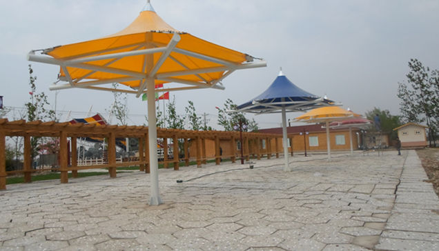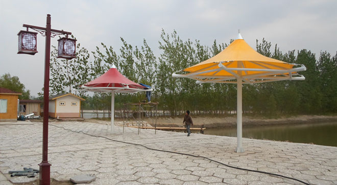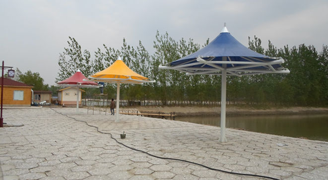 辽宁七彩庄园张拉膜结构景观伞,该项目为永久式景观遮阳伞,其结构为内撑式冒顶膜结构,单帽单立柱支撑,该项目每个都为单个帽顶形式,pvdf建筑膜材裁剪为整张设计张拉,对施工工艺、精度要求高,这种结构是很多景观遮阳项目的选择,其尺寸不受限制,可大可小,可单冒顶,也可无限连帽,为了结构的完美,冒顶装饰可根据现场环境和结构需要设计,该冒顶采用立杆圆盘差异性设计,美观而实用。
