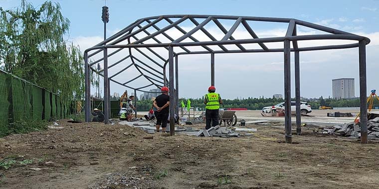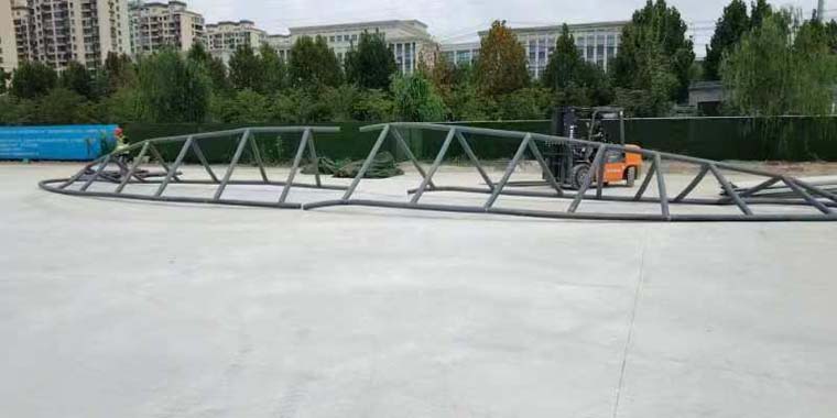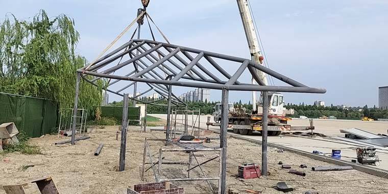 这次仙桃景观长廊膜结构一共有200个平方米,异形的会比较复杂,钢结构部分都在加工厂焊接 拉弯,拼接成形,分成两段,直接运到现场,再组装。这样工程比较省时省力。