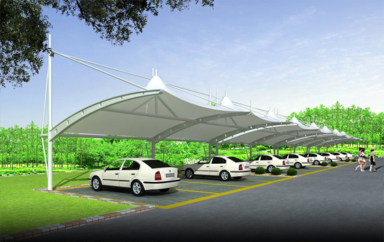 在车棚市场中,膜结构停车棚尤其受到车主的青睐。膜结构停车棚可以为爱车提供一个温暖的港湾,遮阳挡雨,免受阳光暴晒和雨雪侵袭。除了基本的功能以外,膜结构停车棚也是一种建筑造型,美观大方,是单位或者广场一道亮丽的风景线。膜结构停车棚可以使用在社区、学校、企业单位、政府机构、体育馆、工厂等。这种车棚主要采用钢材、钢索和膜材料。使用钢材作为主要支撑构件,配合多种高强度薄膜材料通过一定的方式使其产生张力以形成某种空间形状,这种空间结构可以承受的一定外荷载作用。